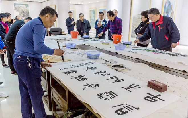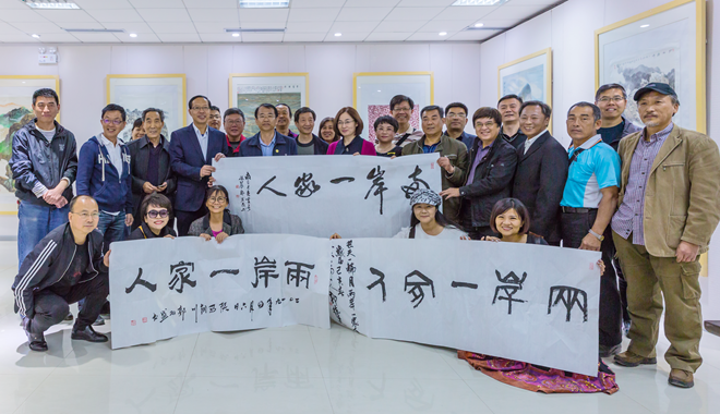随后,两地书画家举行笔会。大家挥毫泼墨,提笔潇洒,落笔有神,现场创作出60余幅风格各异的书画作品,展现了深厚的艺术功底和高超的艺术造诣,观众无不由衷赞叹,书画家们也相互感佩。大家提议共同书写“两岸一家人”的字幅,当五个大字以不同风格呈现在大家面前时,现场爆发出热烈掌声,将气氛推向高潮。不同地域的艺术家用不同字体书写出了相同的情感和共同的心声。最后,两地书画家互赠墨宝,话叙留念,交流活动持续了近 4个小时仍意犹未尽。