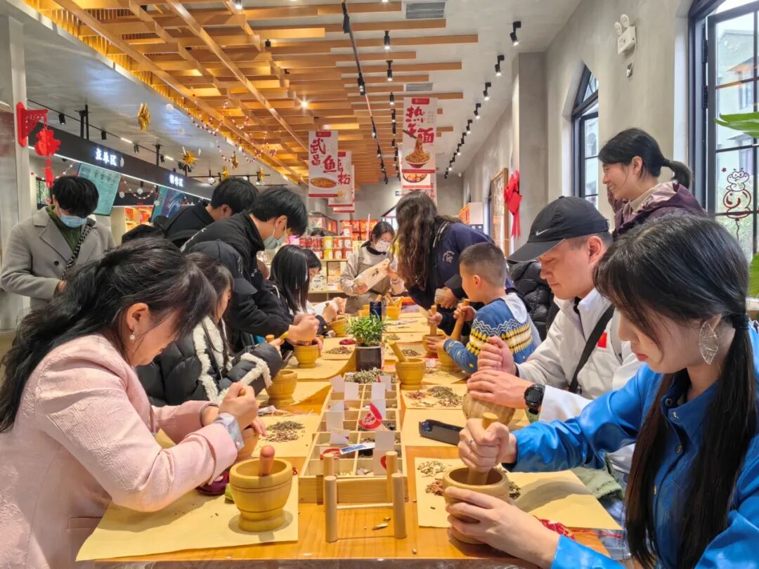 始创于1637年,与“同仁堂”、“胡庆余堂”、“陈李济”一起被誉为中国四大药号的老字号——叶开泰,赓续百年的传承和初心,将传统中医草本的深邃智慧与现代茶饮文化的精致韵味巧妙融合,在武昌昙化林开设了草本茶咖旗舰店。在店内工作人员的指导下,台胞亲手制作中草药香囊,在体验动手乐趣的同时,加深了对中医传统文化的印记。大家一边品尝中药茶饮的独特口感,一边了解其制作工艺和养生功效。台胞纷纷表示,老字号药号的跨界,不仅是对传统中医药文化的一次创新致敬,也是对现代健康生活方式的一次积极探索。