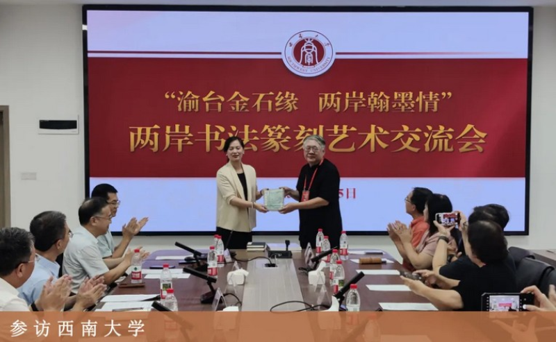 9月15日至18日,第十七届“重庆·台湾周”分项活动“渝台金石缘·两岸翰墨情”书法篆刻艺术交流活动在重庆举行。此次活动由台盟重庆市委会与重庆市政府台办、重庆市政府文史馆、重庆市台联等单位联合主办。来自台湾篆刻家协会的13位艺术家,与重庆市政府文史馆艺术家代表以及綦江农民版画艺术家代表共同参与了书法篆刻展览、文化座谈、书画笔会等多场交流活动。重庆市政协副主席、台盟重庆市委会主委、重庆市政府文史馆馆长王昱出席活动。