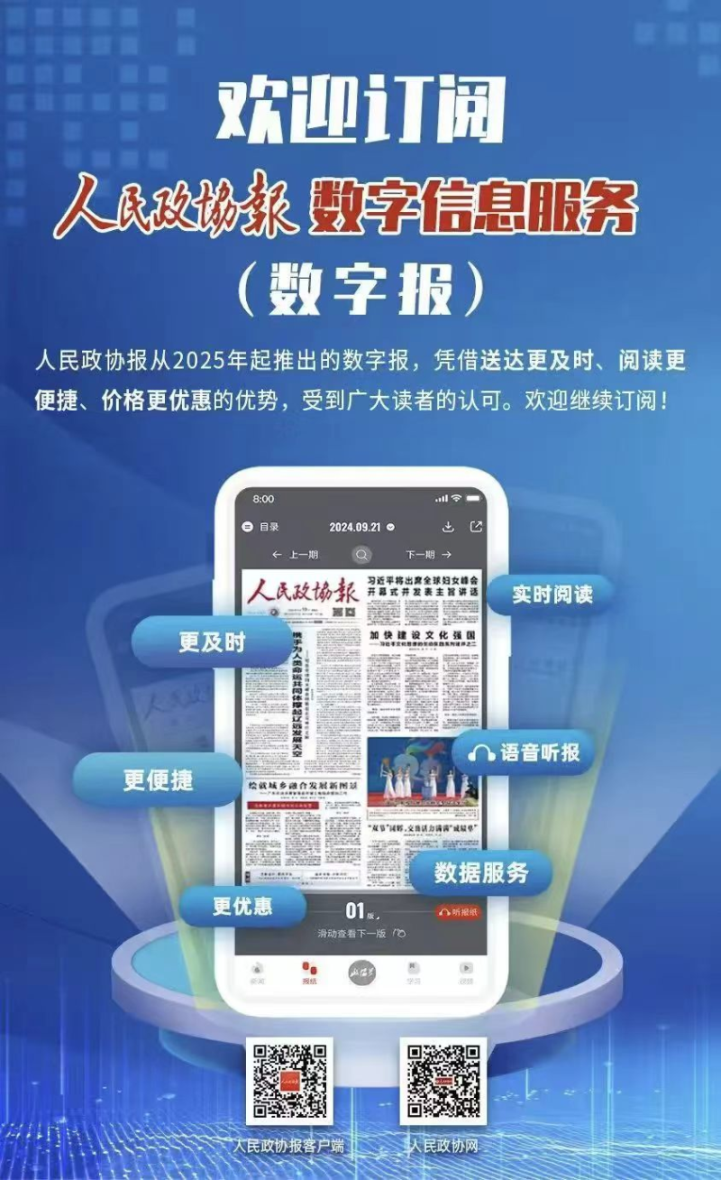 从2025年起,人民政协报社推出数字发行,为读者提供数字信息服务(数字报)。读者可以通过人民政协报客户端、人民政协网等平台实现《人民政协报》在线阅读。数字报送达及时、阅读便捷、价格优惠,与纸质报形成优势互补。每份定价:192元/年。欢迎订阅。