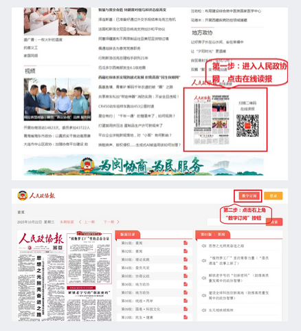 ②登录人民政协网(www.rmzxw.com.cn),找到“在线读报”入口,点击进入,点击“数字订阅”。(具体操作如下图↓↓↓)