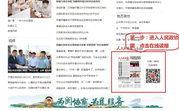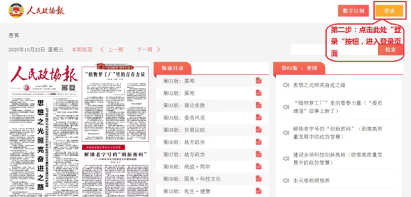 打开人民政协网,找到在线读报入口并点击进入→点击右上角登录按钮后按提示登录。(具体操作如下图↓↓↓)
