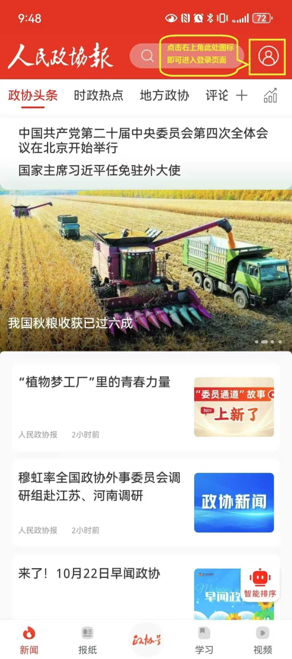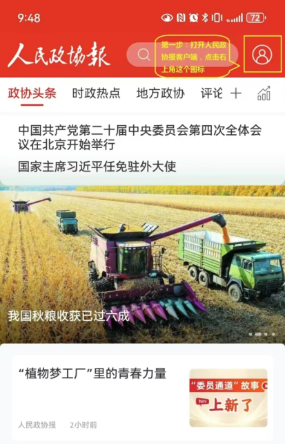 打开人民政协报客户端→ 点击右上角图标进入登录页面,按提示登录。(具体操作如下图↓↓↓)