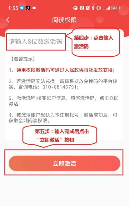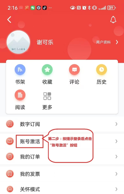 打开人民政协报客户端→ 点击右上角图标→按系统提示登录后, 点击“账号激活”选项→ 输入激活码即可激活。