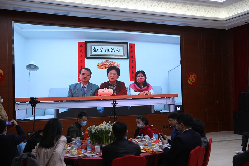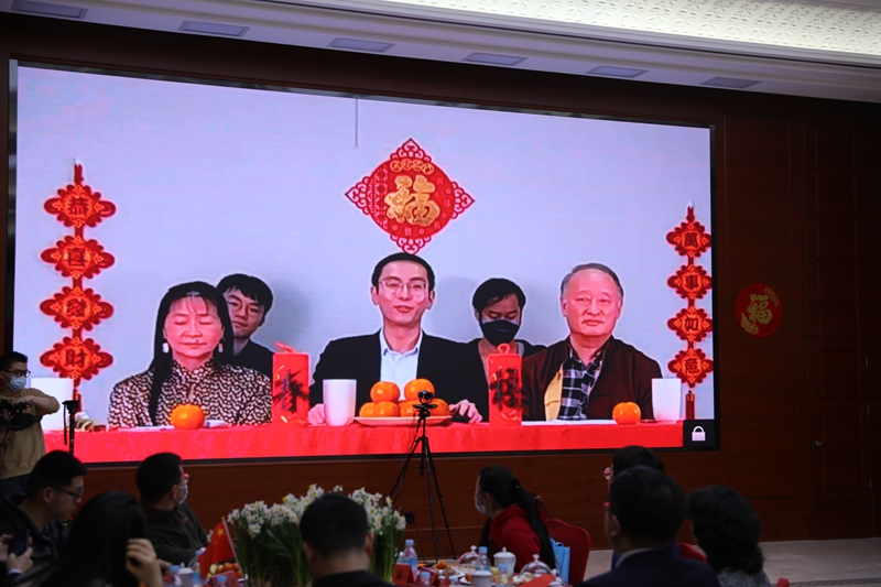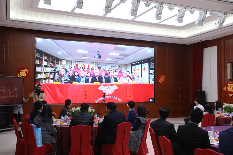 在分会场,台湾地区政治受难人互助会总会长林燿呈等共同唱起歌曲《我和我的祖国》,全场阵阵掌声。劳动党主席吴荣元、《观察》杂志社社长纪欣、中华青年发展联合会理事长王正等台湾嘉宾通过视频连线,向留在大陆的台湾乡亲拜年,期许祖国早日统一。