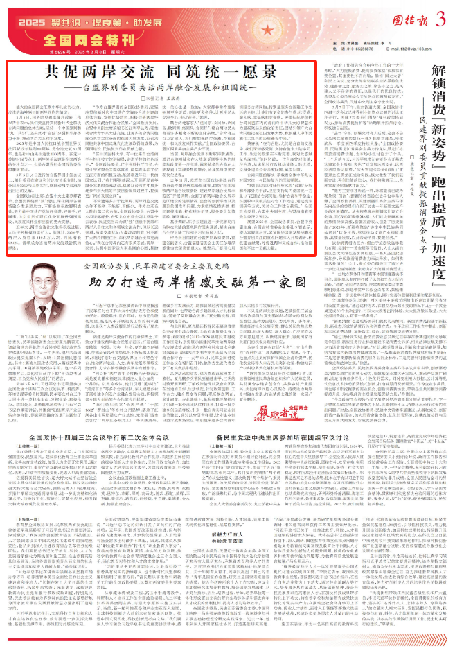盛大的全国两会汇聚中华儿女的心力,浅浅的海峡隔不断两岸同胞的情谊。