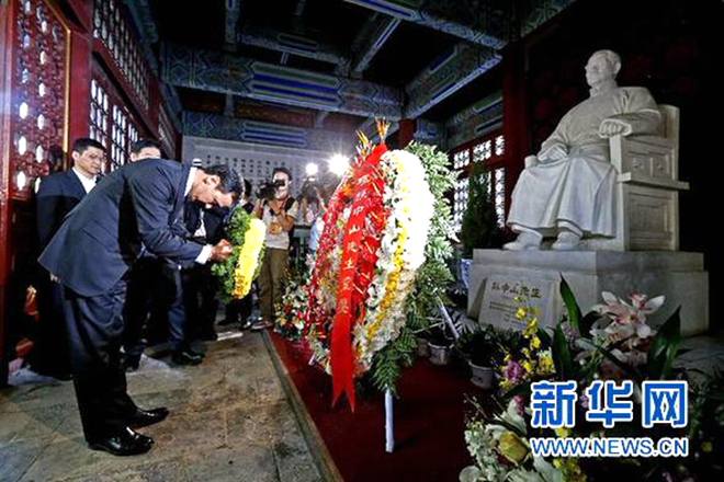 碧空如洗,松涛阵阵。下午5时许,朱立伦一行十余人到达碧云寺,首先步入寺内所设的孙中山纪念堂。纪念堂正中安放着中山先生汉白玉全身塑像,前门摆放的花圈缎带上,写着“总理孙中山先生灵鉴”,落款“中国国民党主席朱立伦敬献”。
