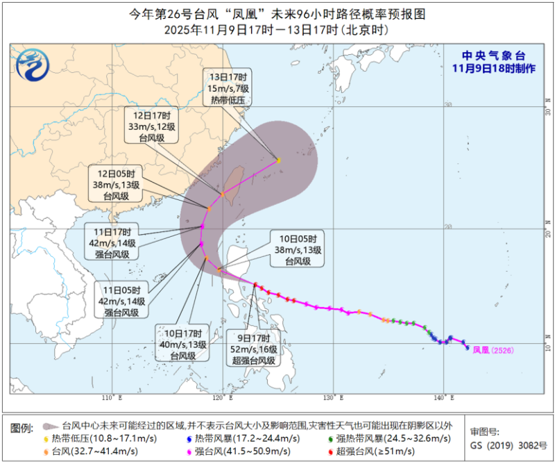 中国台湾网11月9日讯 据中央气象台消息,今年第26号台风“凤凰”(超强台风级)预计在11月9日晚,将穿越吕宋岛,并在10日中午左右进入南海中东部海域。预计11日清晨强度会再次增强,12日凌晨开始逐渐转向东北,强度减弱,向台湾岛西南部沿海靠近。