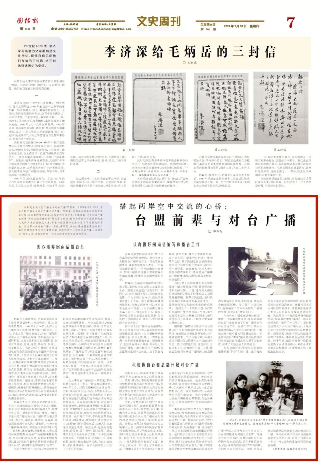 今年是中央人民广播电台对台广播70周年。1954年8月15日,中央人民广播电台对台广播正式开播。70年来,从两岸对峙年代到和平发展时期,从早期的隔空喊话,到现在的方言交流、立体传播,中央对台广播承担着“两岸交流媒体先行”的任务与职责,把中央对台方针政策和大陆人民的声音直接播送入岛,为推动祖国统一大业作出了不可替代的贡献。作为第一代对台广播人,苏新、蔡子民、李玲虹等台盟前辈为对台广播的创建和发展作出了重要贡献,深深影响了一代代对台广播人承前启后、倾尽心力,为祖国的统一大业传递着坚定而温暖的声音。